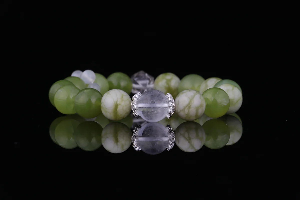 Natural Green Grape Milk Green Crystal Bracelet, belonging to the Wood element, helps you attract wealth, bring good fortune, calm your mind, and improve sleep. Made from carefully selected natural raw stones, it contains the earth's energy. Its soft luster soothes anxiety, and the green color corresponds to the heart chakra, attracting wealth. Wear it daily on your left hand, paired with simple outfits for an elegant look. Suitable for personal use or as a gift to friends. Each bracelet has unique patterns, and encountering it is a sign of fate.