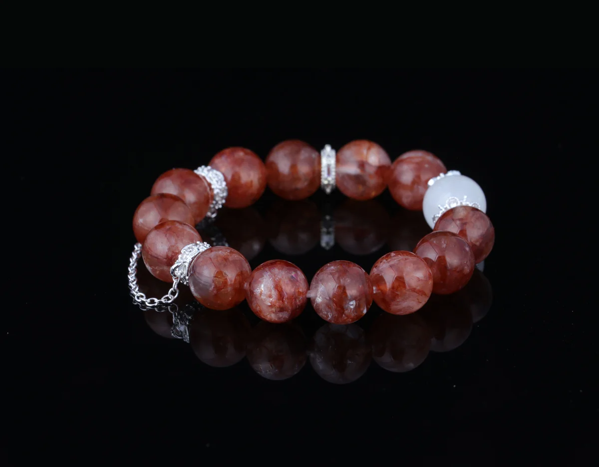 t is the material of the bracelet, and what are its characteristics? Answer: The bracelet is crafted from carefully selected natural red phantom-included white quartz. This is a unique natural crystal where red phantom inclusions coexist with white quartz, creating a visual effect reminiscent of "gold within fire." Each bead is one-of-a-kind, with distinct patterns, ensuring the exclusivity and uniqueness of every bracelet. This natural material is not only aesthetically pleasing but also carries high-frequency energy, serving as the core foundation of the product's efficacy.
