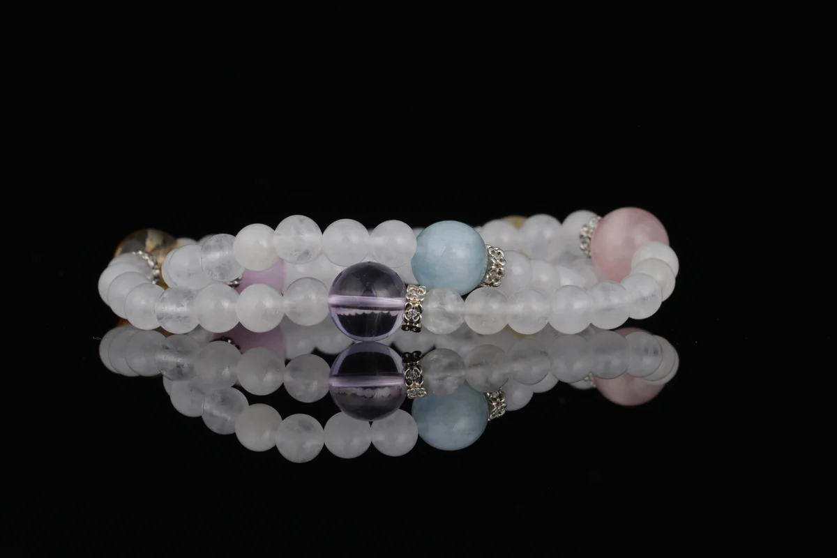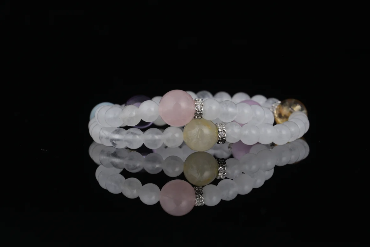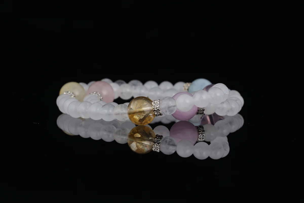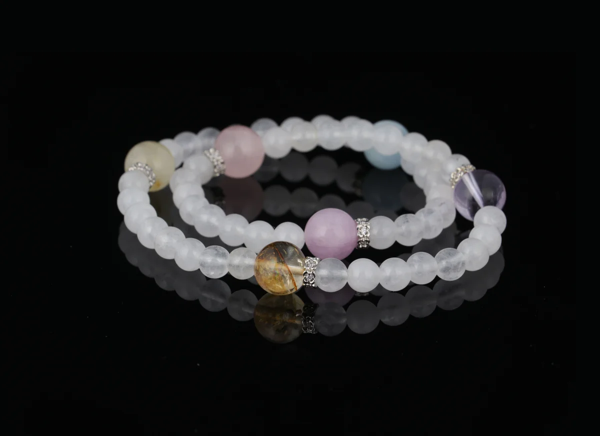 t are the effects of different crystals in the bracelet? Answer: The rose quartz, clear quartz, citrine, and amethyst in the bracelet each have unique effects: rose quartz attracts love and improves relationships, clear quartz purifies negative energy, citrine enhances wealth and career luck, and amethyst aids wisdom and spirituality. The combination of multiple crystals works synergistically to create a powerful energy field, boosting your wealth, relationships, and career comprehensively. These natural crystals are carefully polished by craftsmen and customized based on the Five Elements energy to address deficiencies in your fortune. Wearing them daily can attract wealth and blessings, while placing them by your pillow at night can promote restful sleep and calm the mind, providing comprehensive fortune enhancement and spiritual healing.