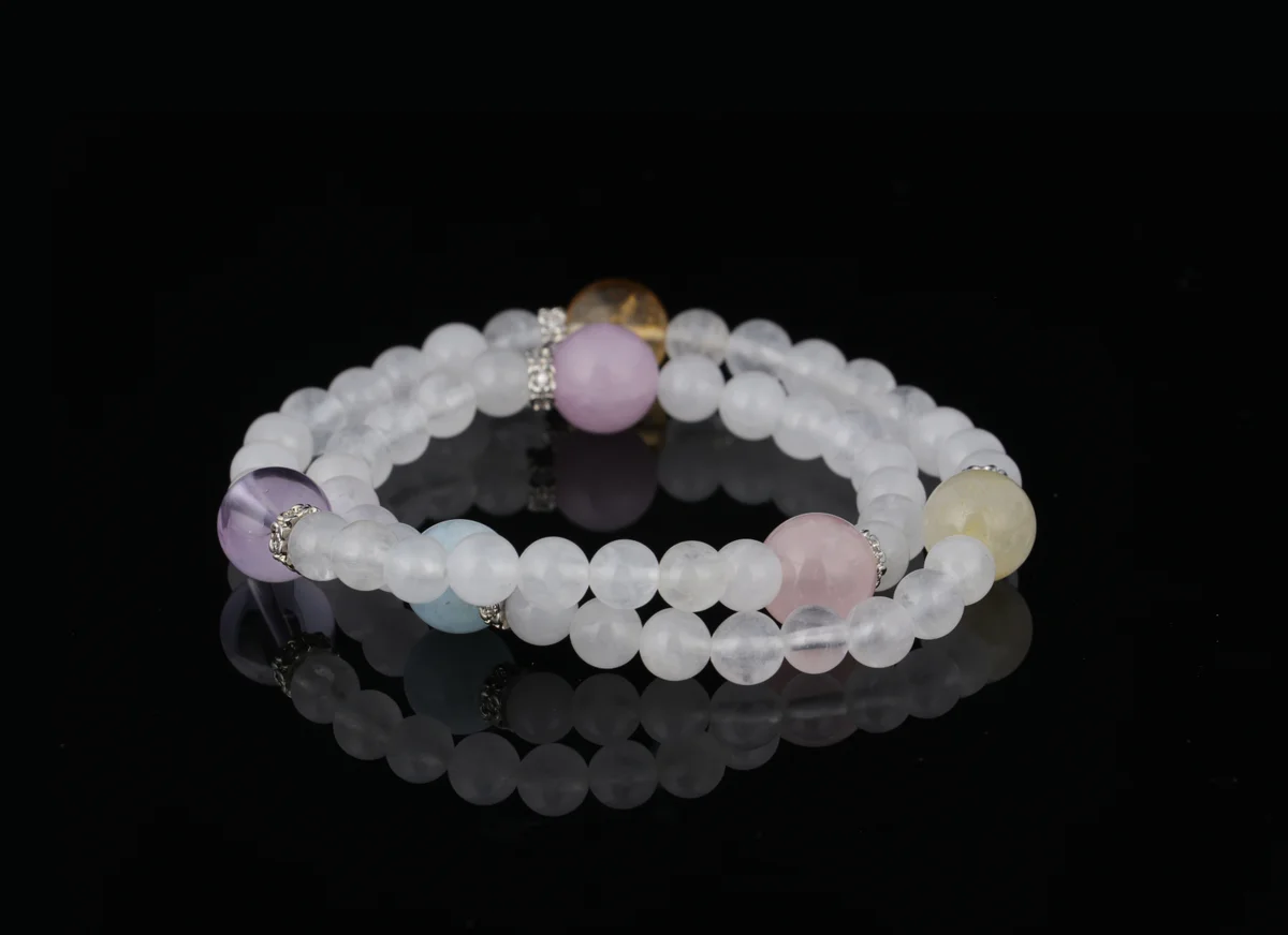 t is the material and craftsmanship of the bracelet? Answer: The bracelet is crafted from natural rose quartz, clear quartz, citrine, and amethyst. Each crystal is sourced from natural raw minerals and meticulously polished by skilled artisans to ensure high quality and pure energy. These crystals correspond to the balance of the Five Elements and are custom-blended based on birth dates to create a powerful energy field. The production process emphasizes attention to detail, with limited mining, making each bracelet a unique energy carrier. Made from natural materials with exquisite craftsmanship, it is designed to harness the synergistic power of multi-colored crystals to enhance your wealth, relationships, and career comprehensively. It also offers versatility for daily wear and bedtime use.
