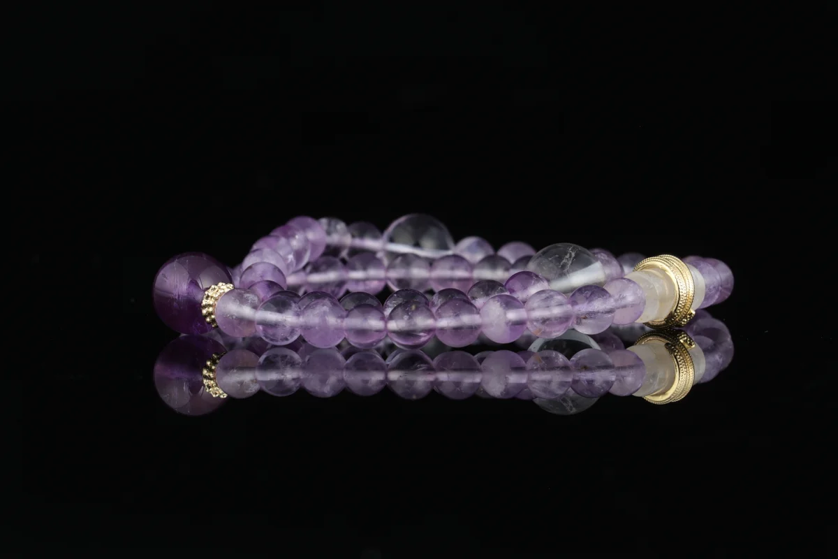 t are the characteristics of the material and craftsmanship of this bracelet? Answer: The bracelet is crafted from natural amethyst and clear quartz crystals, each polished from raw ore and imbued with the earth's spiritual essence, ensuring high quality and pure energy. The material is 100% natural crystal, not synthetic, and undergoes meticulous craftsmanship. Each piece is limited edition and unique—once it's gone, there won't be another like it. It's perfect as a collectible or as a daily-wear personal energy field.