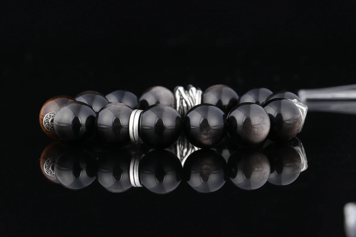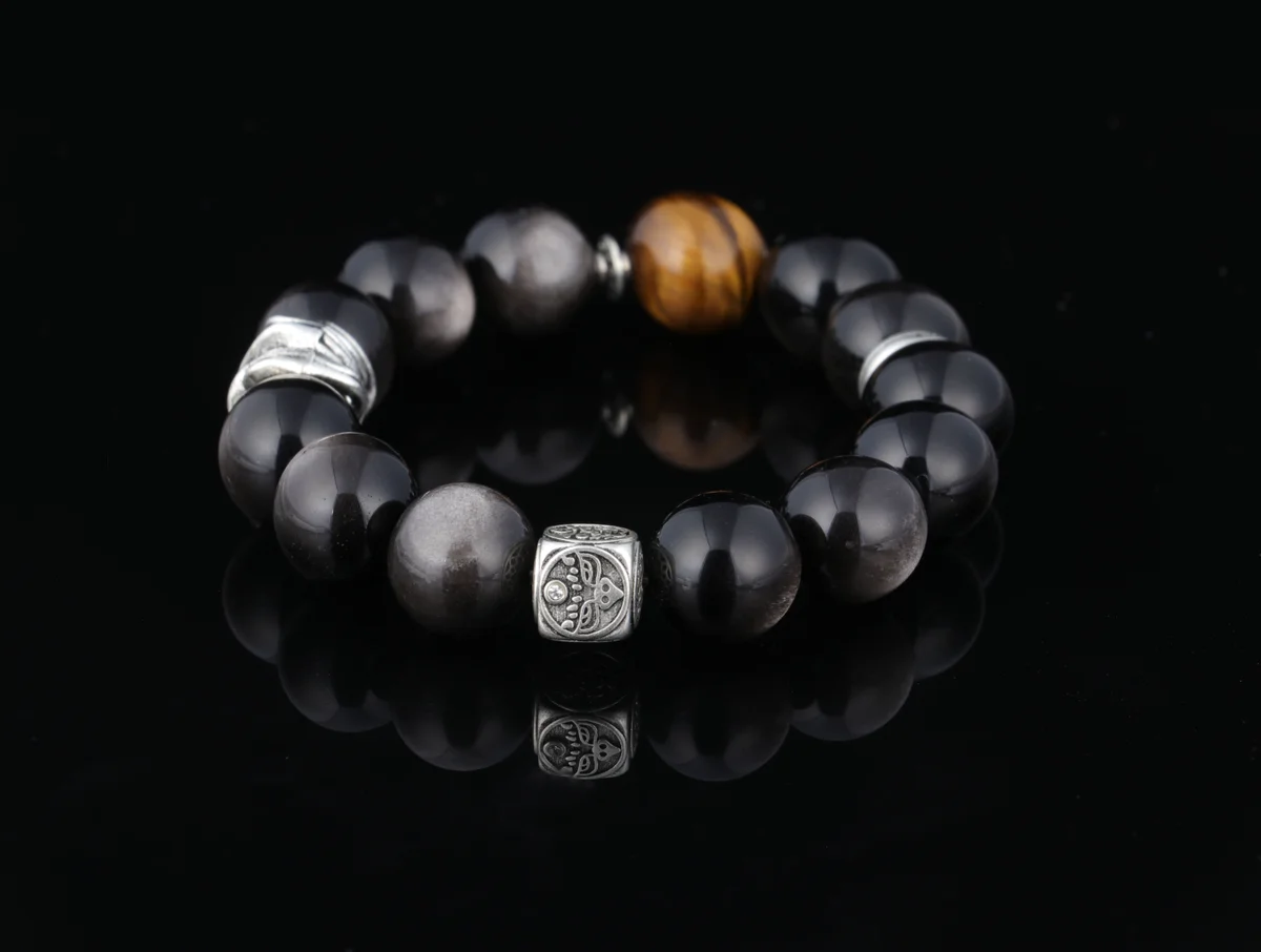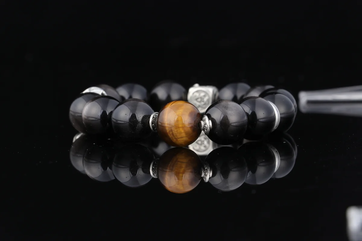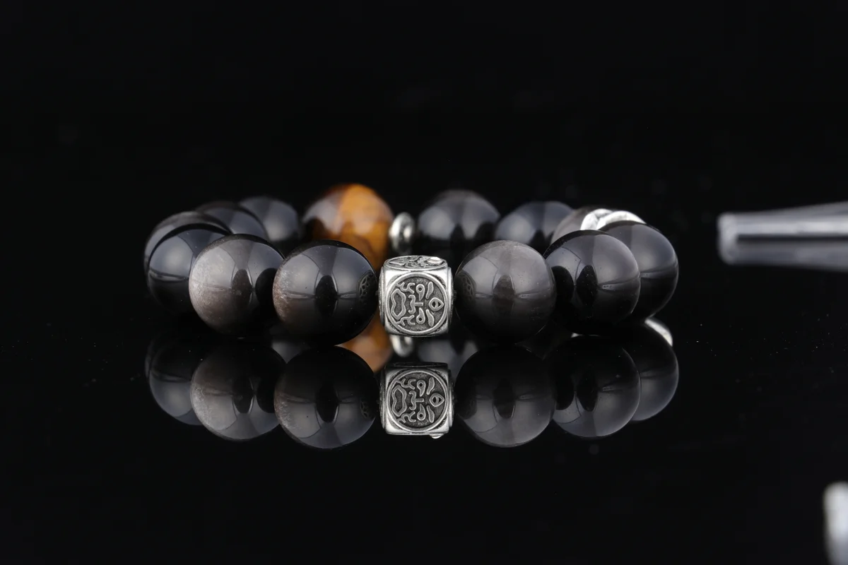 t are the characteristics of the bracelet's material and craftsmanship? Answer: This bracelet is crafted from natural Tiger's Eye and Silver Obsidian. Each bead is hand-polished from natural rough stones, ensuring a flowing cat's eye effect that resembles the watchful gaze of a tiger. As noted in the product description, every unique pattern is a one-of-a-kind gift from the earth, meaning each bracelet is truly unique. This custom birthstone energy bracelet combines traditional craftsmanship with natural materials to deliver optimal spiritual energy effects.