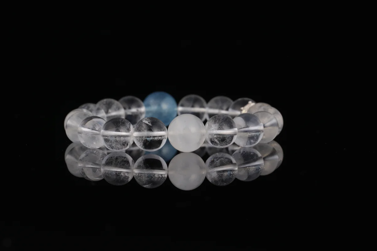 t are the benefits of this Natural White Crystal White Phantom Aquamarine Bracelet? Answer: This bracelet combines the energy of three natural crystals, offering multiple benefits. White Crystal, known as the "Crystal King," purifies the body, mind, and aura. White Phantom specifically attracts legitimate wealth, aiding in career success and financial accumulation. Aquamarine helps stabilize emotions, promotes communication, and brings assistance from helpful people. The powerful combination of these three crystals works together to dispel negative energy, open channels for wealth and good fortune, and amplify energy. It is suitable for career advancement, business management, or daily protection.