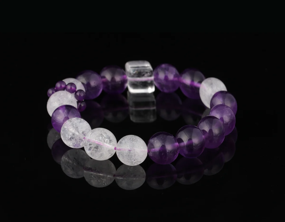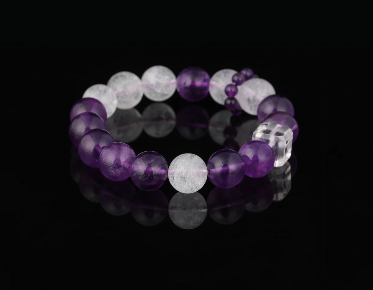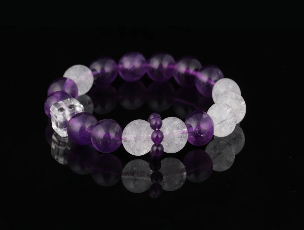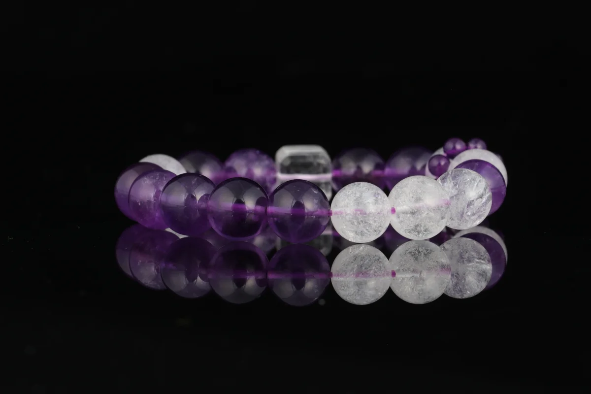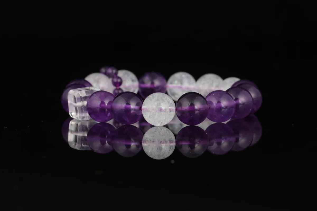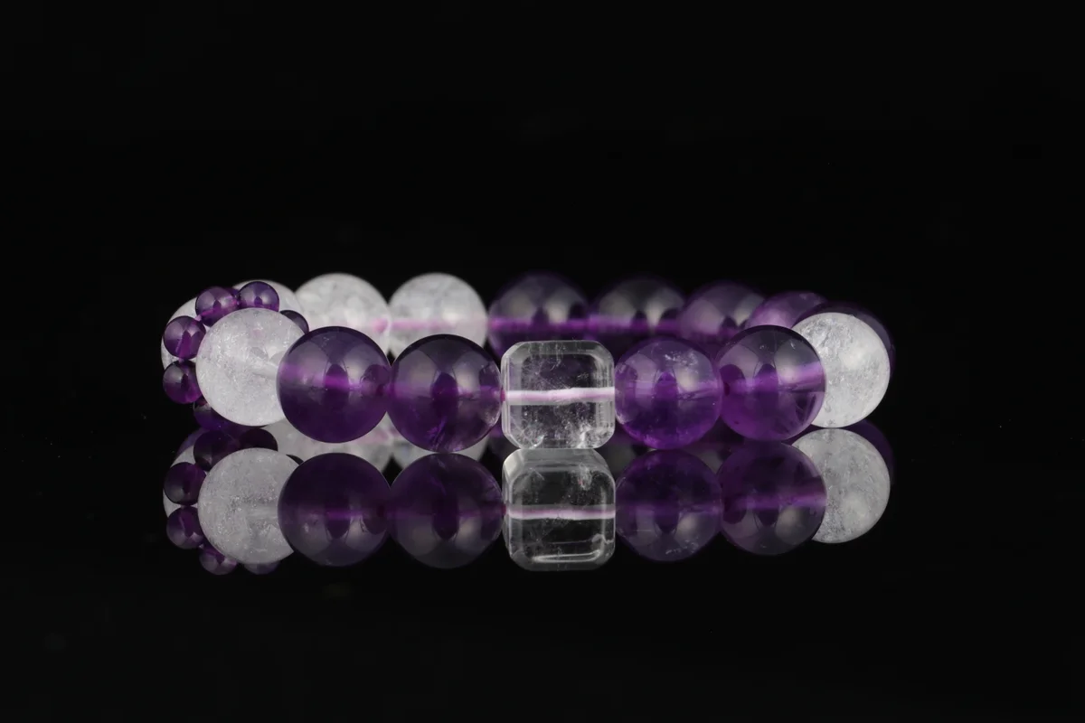 t is the material and quality of this bracelet? Answer: This bracelet is crafted from natural amethyst, featuring carefully selected transparent crystals with high-grade white flash characteristics that refract brilliant light in the sun. The product description emphasizes that it is not just an accessory but also an energy guardian stone, ensuring natural quality. It corresponds to the crown chakra to help alleviate stress, improve sleep, and is suitable for use as a health crystal and career crystal.