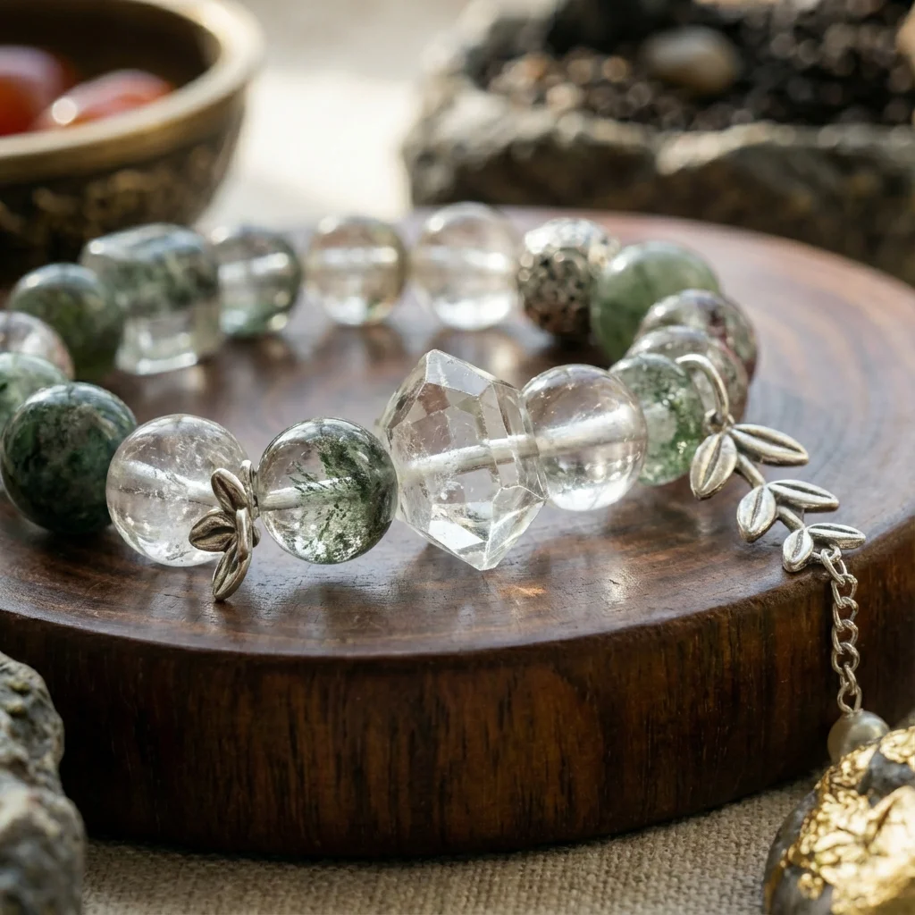 A.t are the characteristics of the material and design of this bracelet? Answer: This bracelet is crafted from natural green tourmaline and clear quartz, with each stone being a unique piece shaped by nature, featuring a distinctive free-form design that highlights a light luxury and niche style. The natural crystals possess a lively luster and pure energy, requiring minimal processing to preserve the raw beauty of the original stones. It is ideal for users seeking a blend of individuality and energy.
