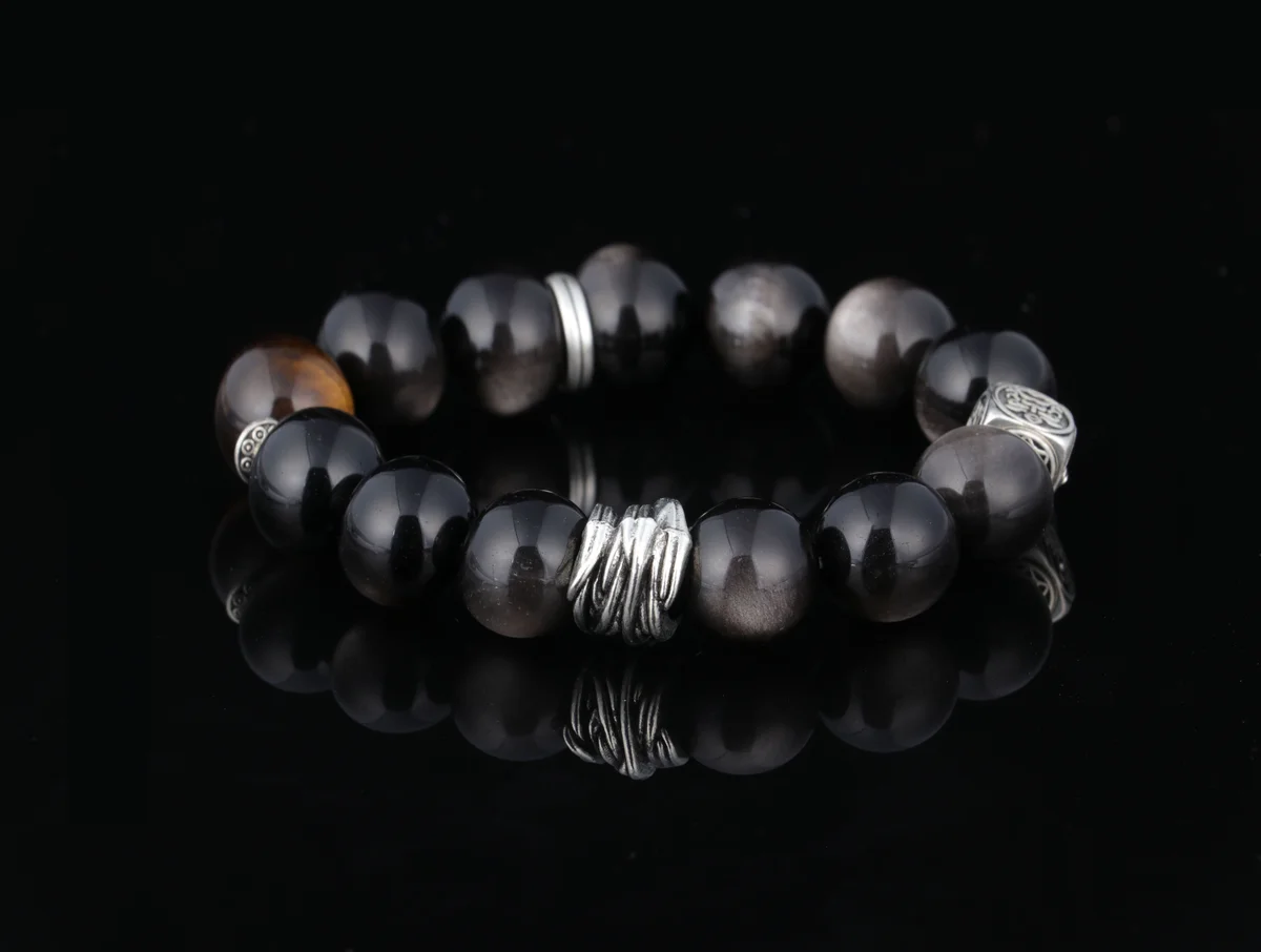 -32%Natural Obsidian Bracelet with Swirl Silver Custom Birthstone for Wealth Attraction, Evil Warding, Protection, and Zodiac Year Fortune